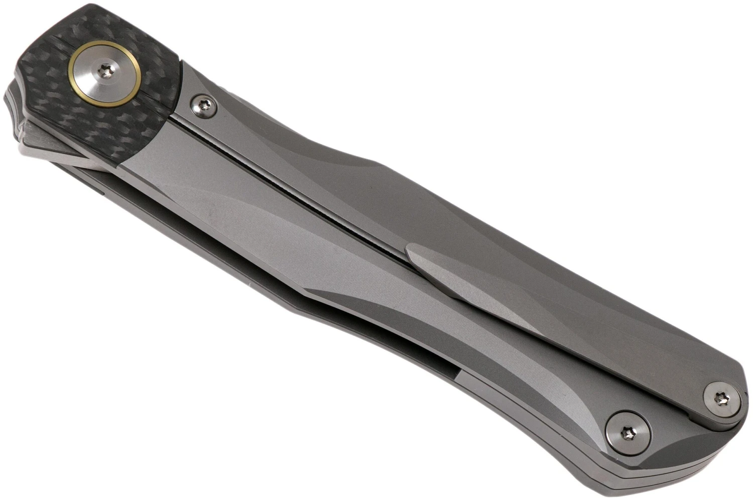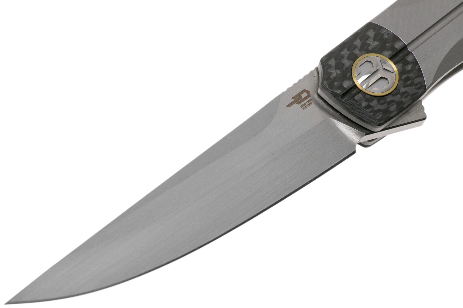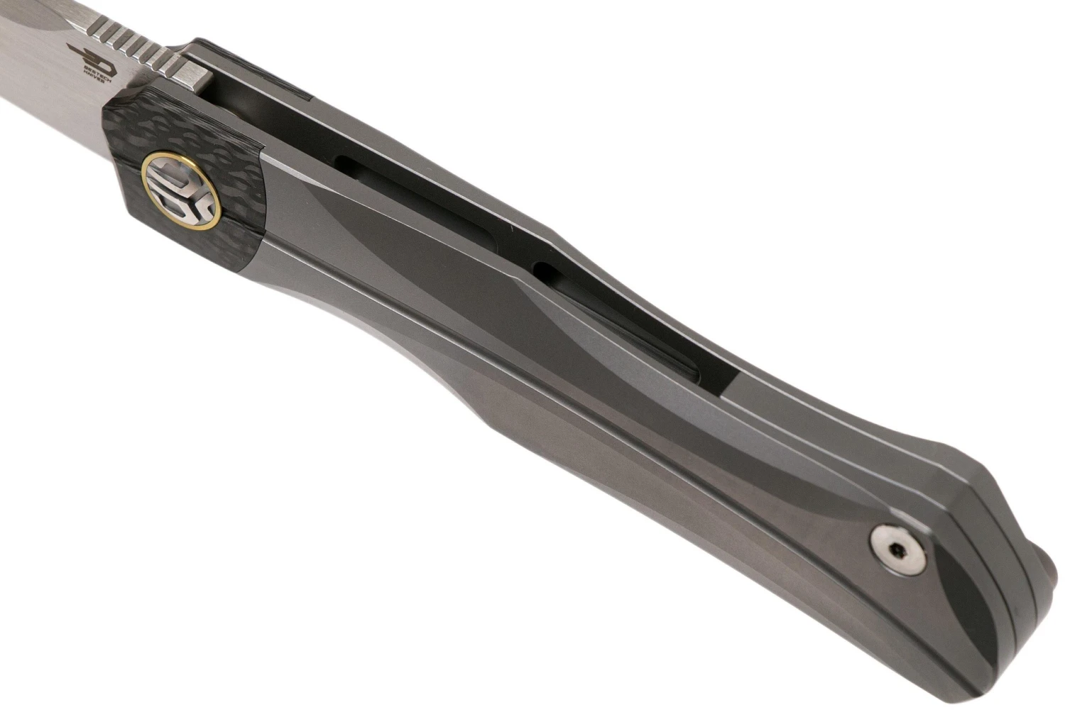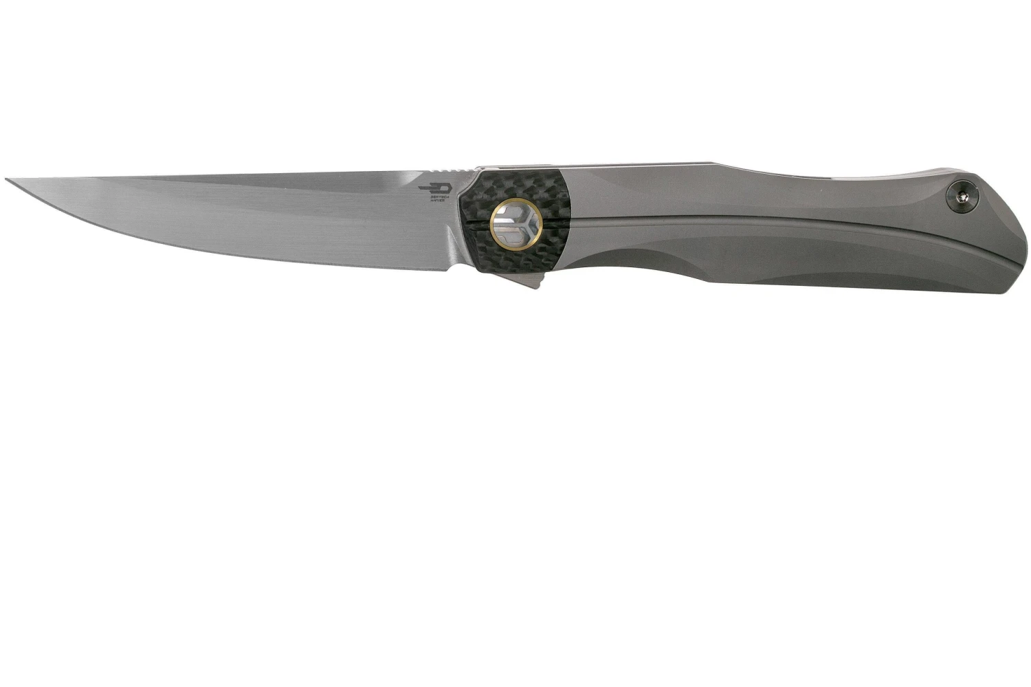 Bestech Thyra BT2106A Grey Blasted Titanium, Carbon Fibre Bolster, Satin Navaja, Diseño Kombou