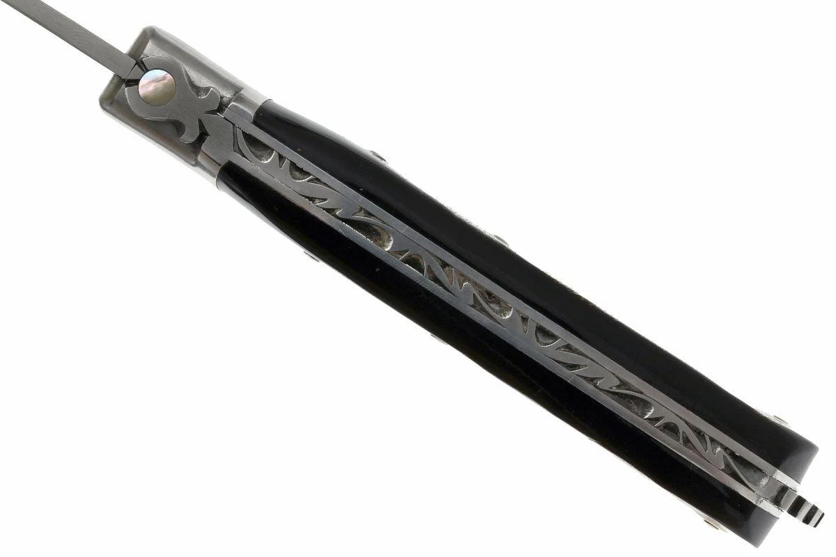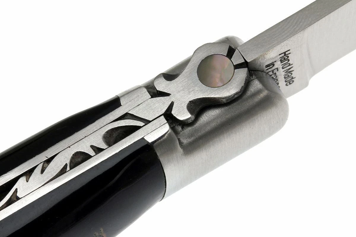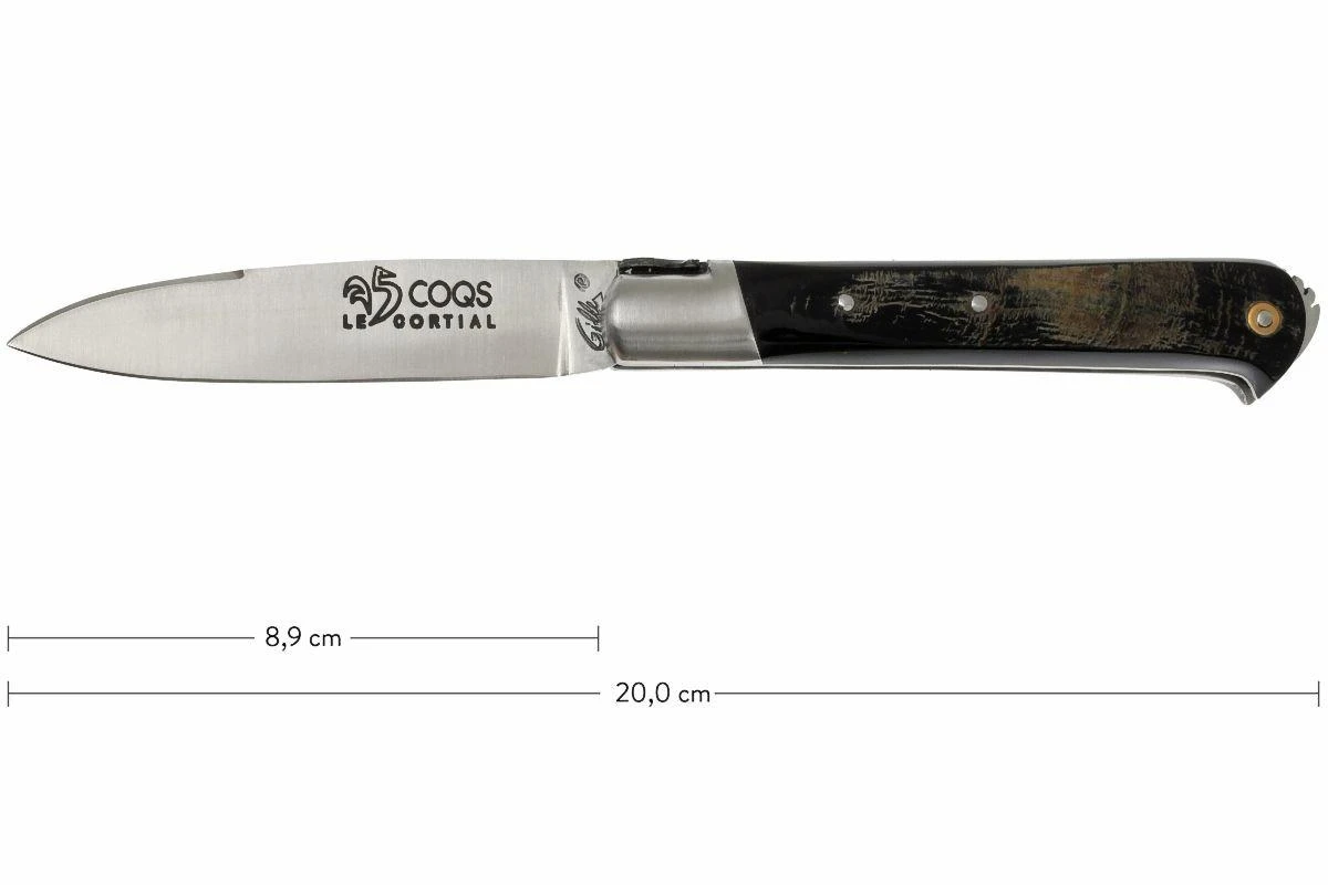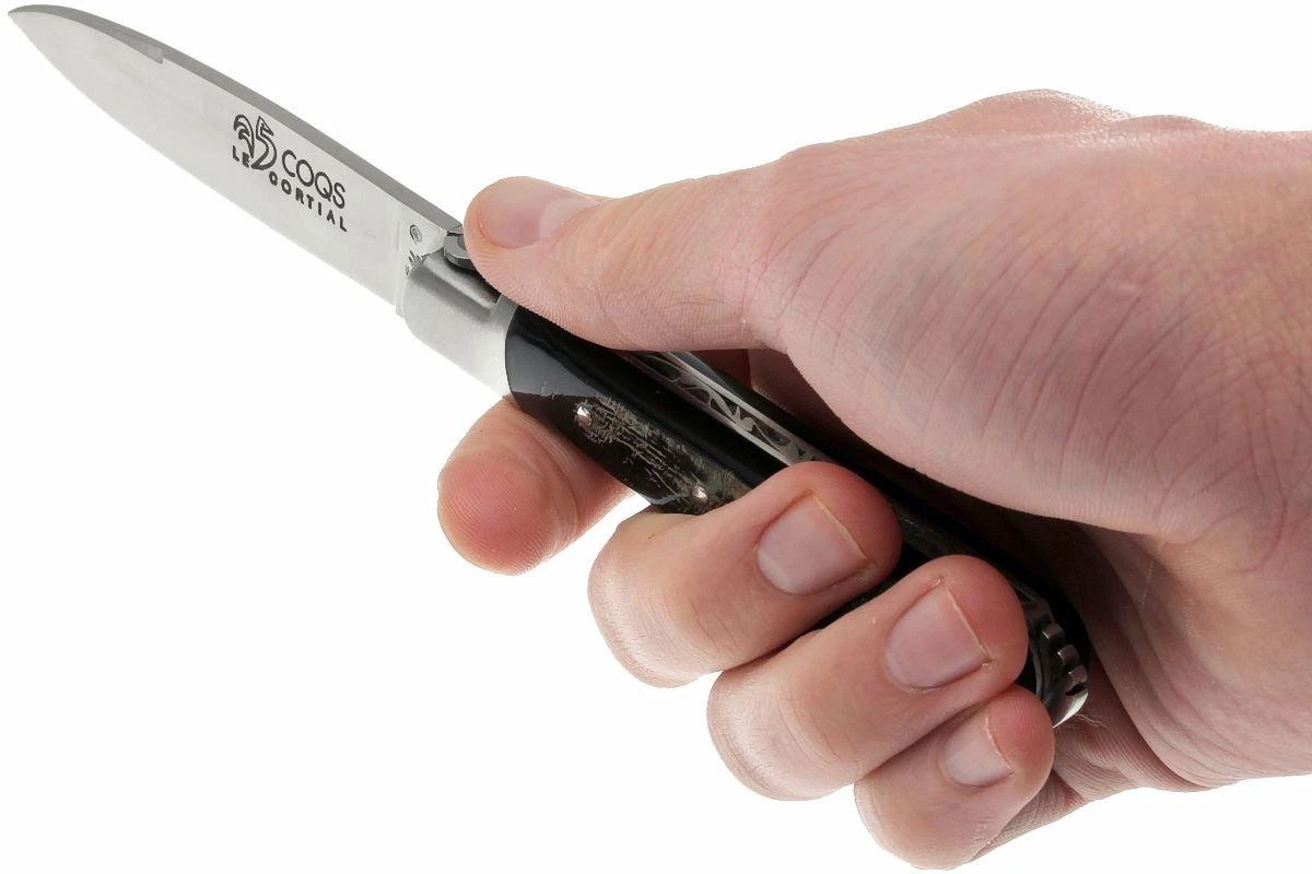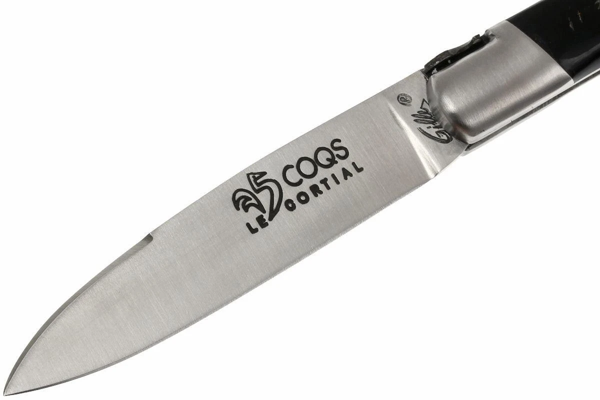 La serie «5 Coqs» de Fontenille Pataud debe su nombre a un pequeño pueblo, Yssingeaux, en Francia. Se pronuncia como «i-sin-jo» y significa, en el dialecto local, «cinco gallos jóvenes». Los gallos no aparecen únicamente en el nombre de la serie de cuchillos. La hoja también presenta un gallo estilizado. El número «5» está bellamente realizado en forma de gallo. Y el dorso del cuchillo recuerda bastante a la cabeza de un gallo con cresta. Presta atención a los ojos del gallo, que presentan dos colores. Fíjate también en el esquilón de perlas que se ha añadido a la «mosca» alternativa, que tiene una forma casi de Ankh eqipcio.