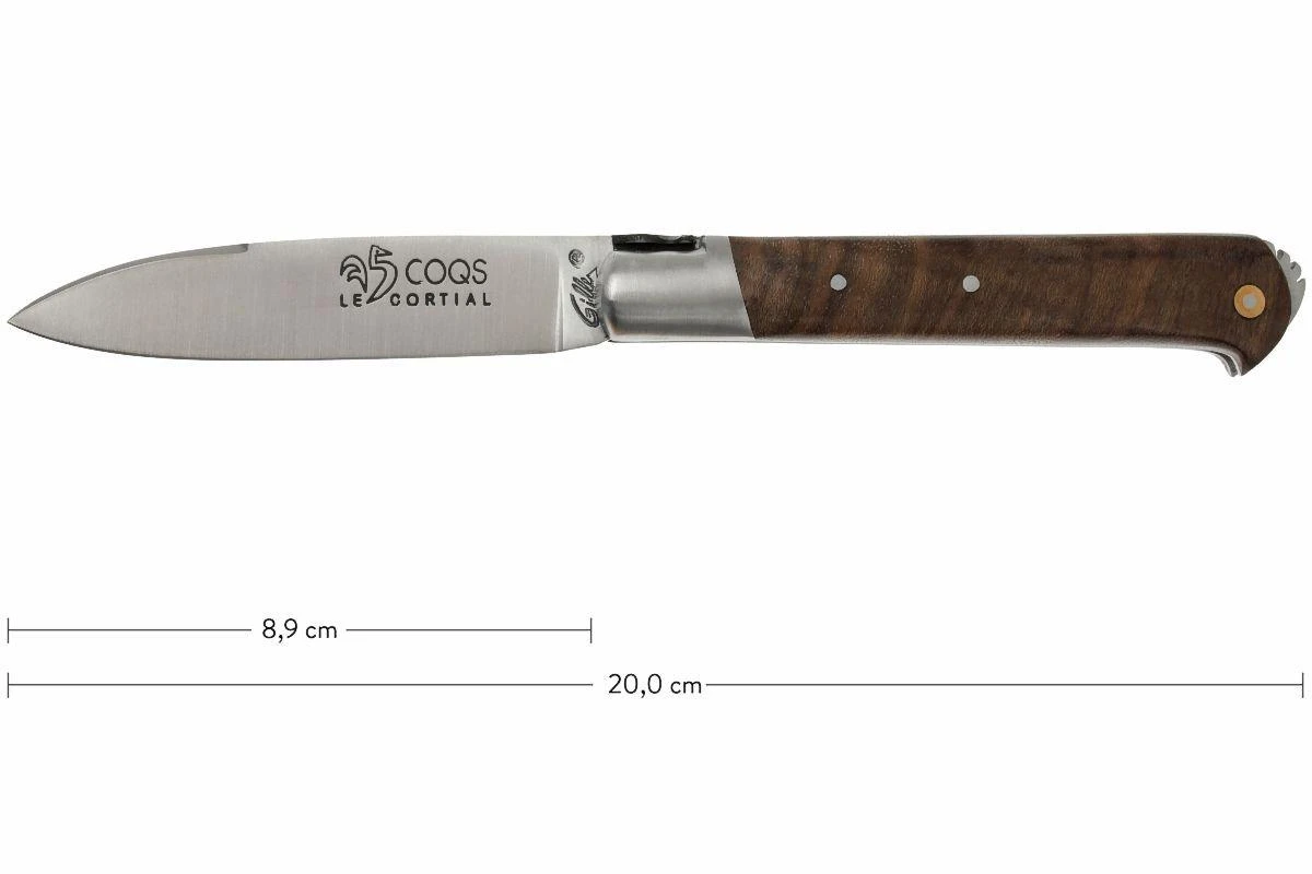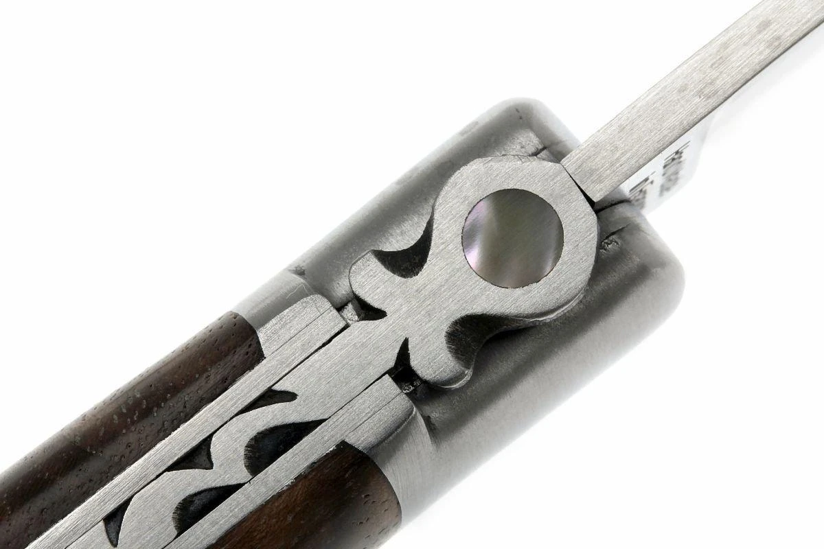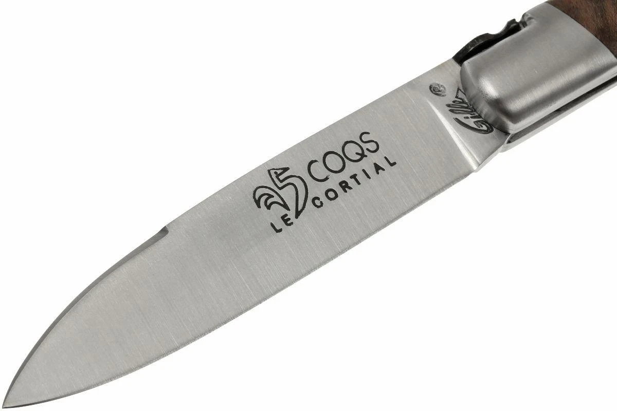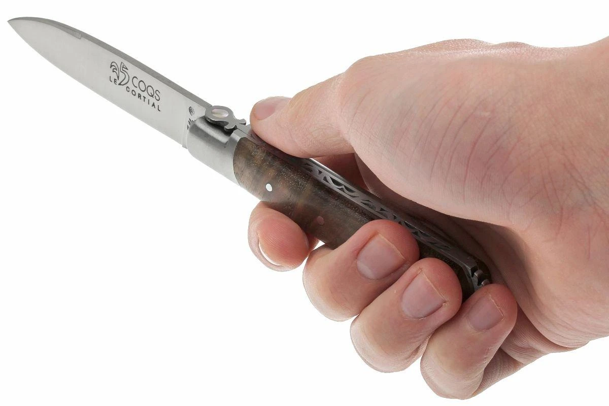 La colección «5 Coqs» de Fontenille Pataud debe su nombre a un pequeño pueblo, Yssingeaux, en Francia. Se pronuncia como «i-sin-jo» y significa, en el dialecto local, «cinco gallos jóvenes». Los gallos no aparecen únicamente en el nombre de la colección de cuchillos. La hoja también presenta un gallo estilizado. El número «5» está bellamente realizado en forma de gallo. Y el dorso del cuchillo recuerda bastante a la cabeza de un gallo con cresta. Presta atención a los ojos del gallo, que presentan dos colores. Fíjate también en el esquilón de perlas que se ha añadido a la «mosca» alternativa, que tiene una forma casi de Ankh eqipcio.